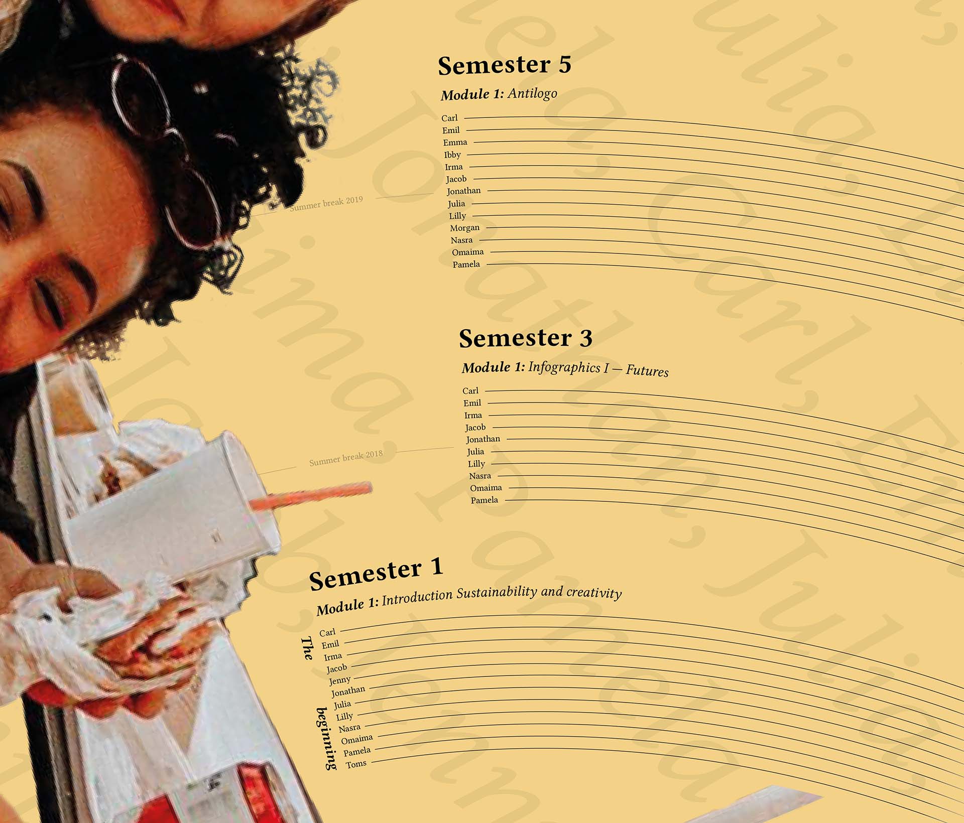 For the graduation party of my class in uni, I created a large-scaled infographic showing all the modules we had passed in our 3-year education. My goals were celebrating this milestone and adding nostalgia to our farewell. As a background I used a photograph taken at the end of our second term.