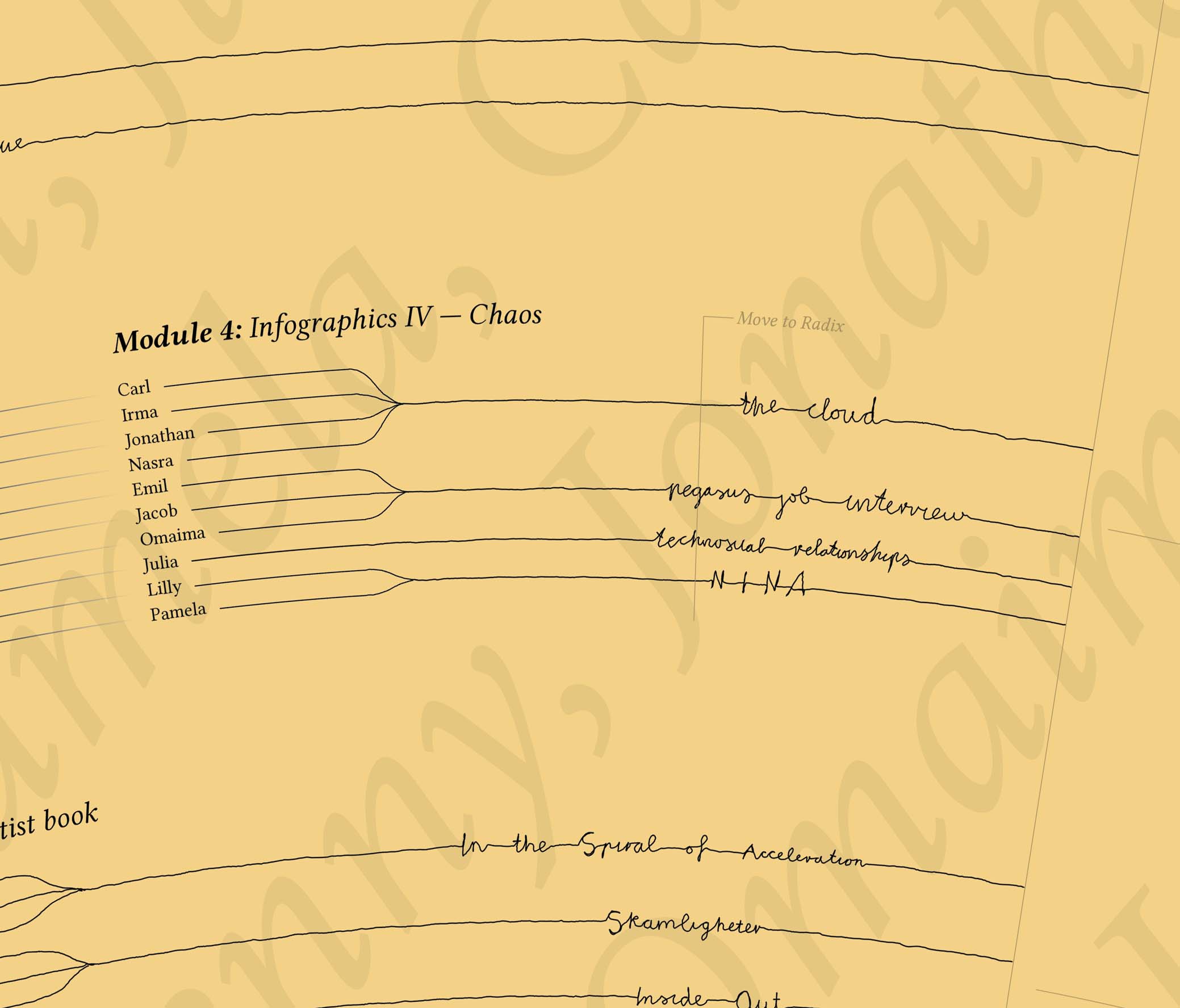 To give a sense of overview I displayed the years as a spiraling timeline. It is broken up by the beginning and end of each semester, module and break. I particularly wanted to highlight our group projects. For these modules I included the name of each project and specified who created it together.